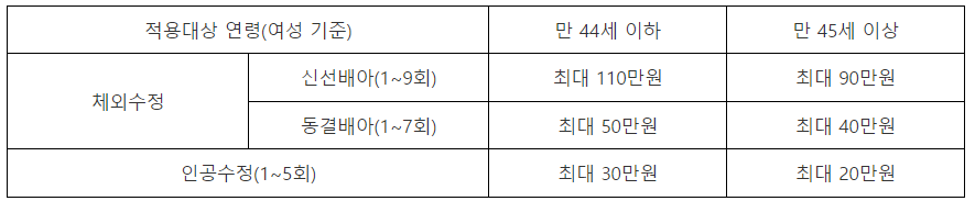 난임 지원은 체외수정, 인공수정 시술을 지원해주며, 여성 나이에 따라 지원 금액이 다르니 아래 표를 참고해주세요.