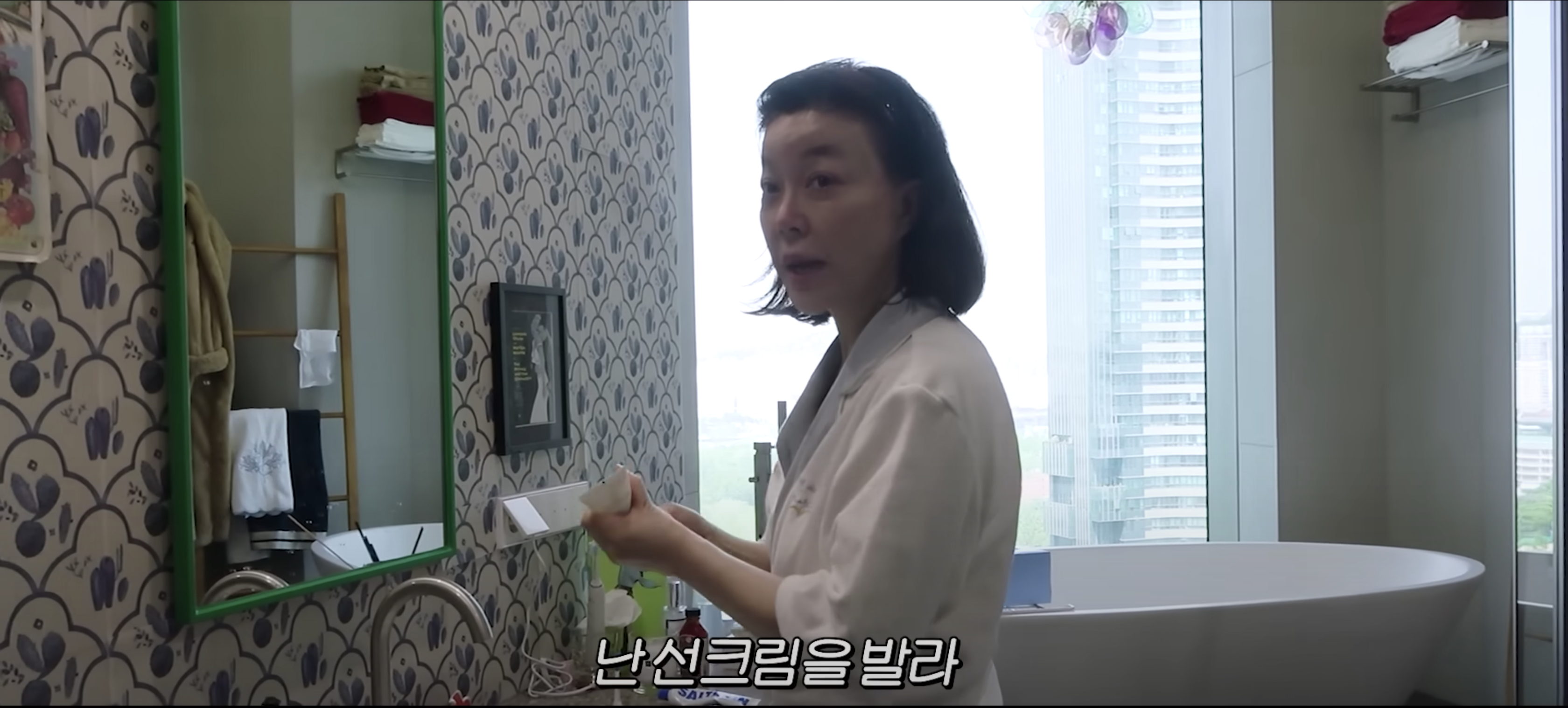 세안 후, 미스트 뿌리고, 토너 바르고 집에서도 선크림을 바르신다고하는 최화정.