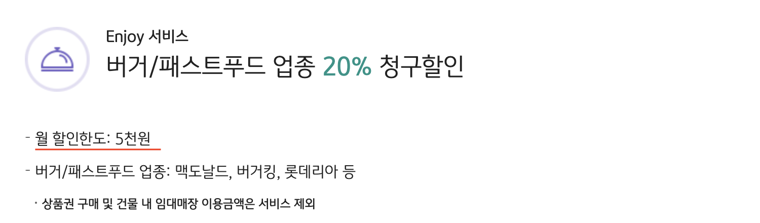 | 버거/패스트푸드 업종 (맥도날드,버거킹, 롯데리아) | 20% | 5천원 |