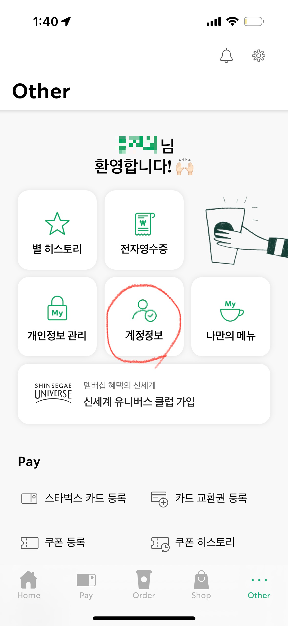1. 스타벅스 앱 메뉴에서 Other 클릭 후, 가운데 계정 정보를 클릭합니다.
