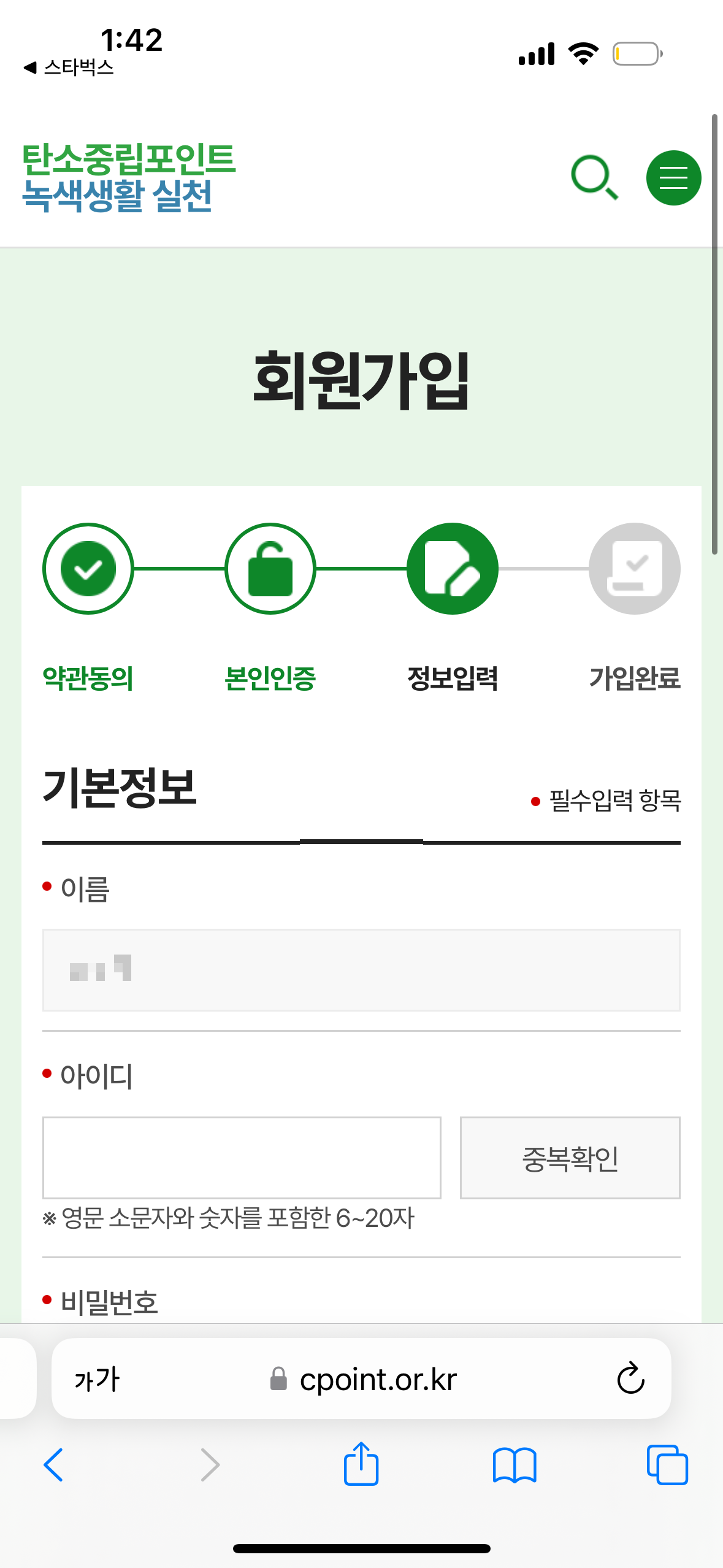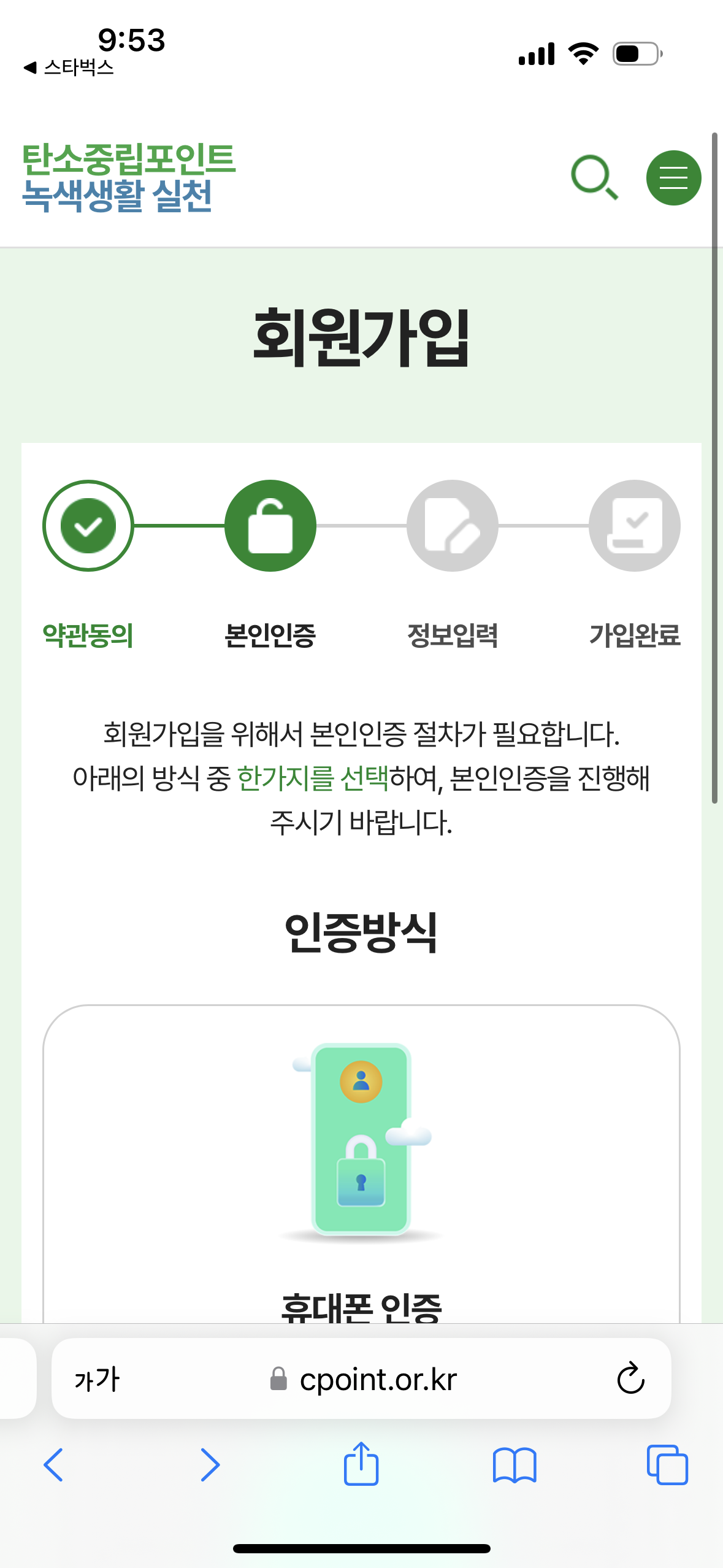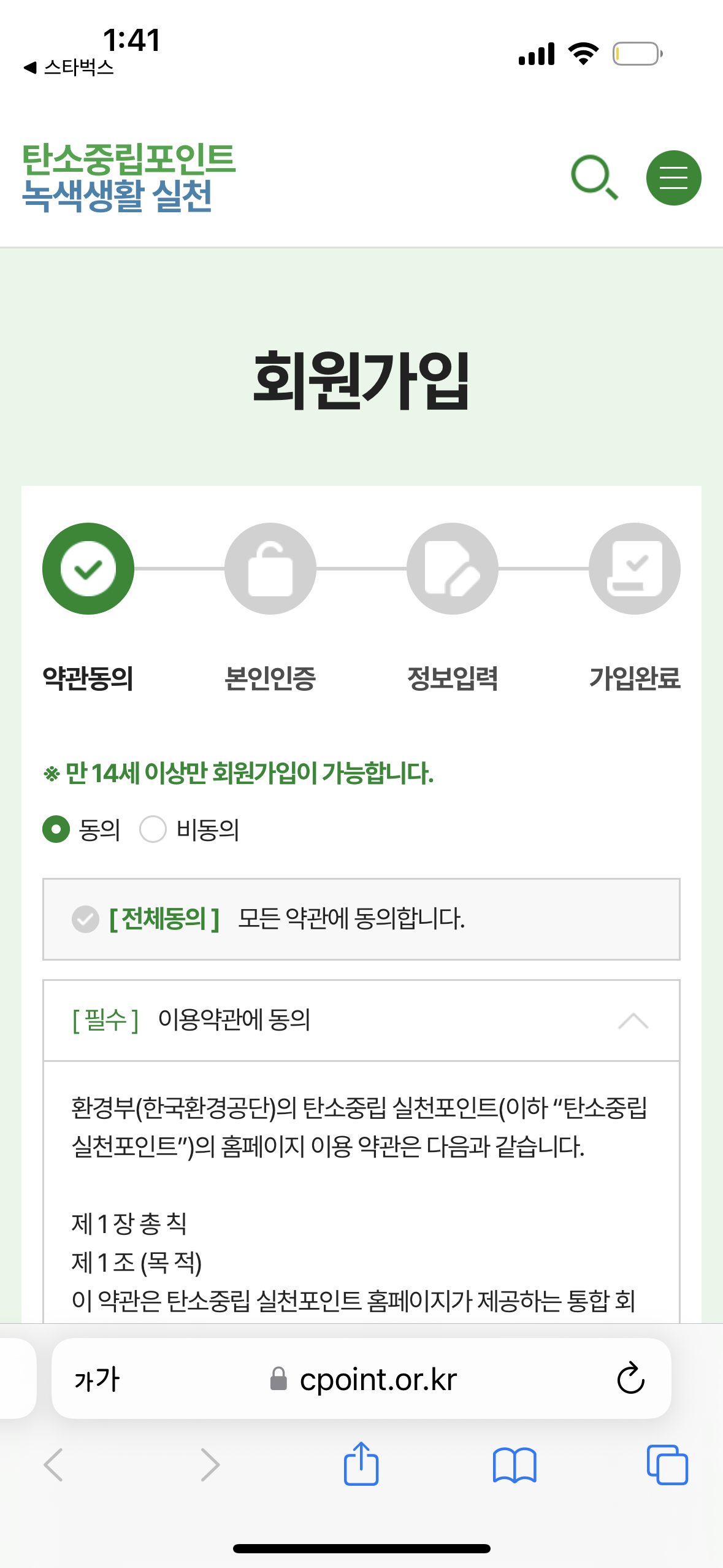 6. 탄소중립포인트 홈페이지에서 약관동의, 본인인증, 회원가입을 차례로 진행합니다.