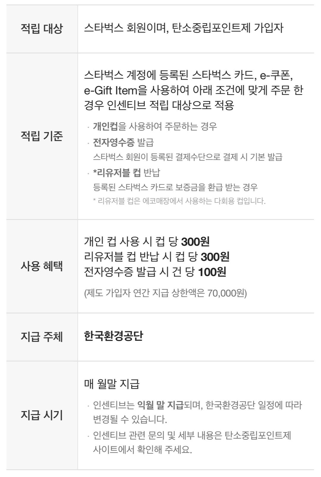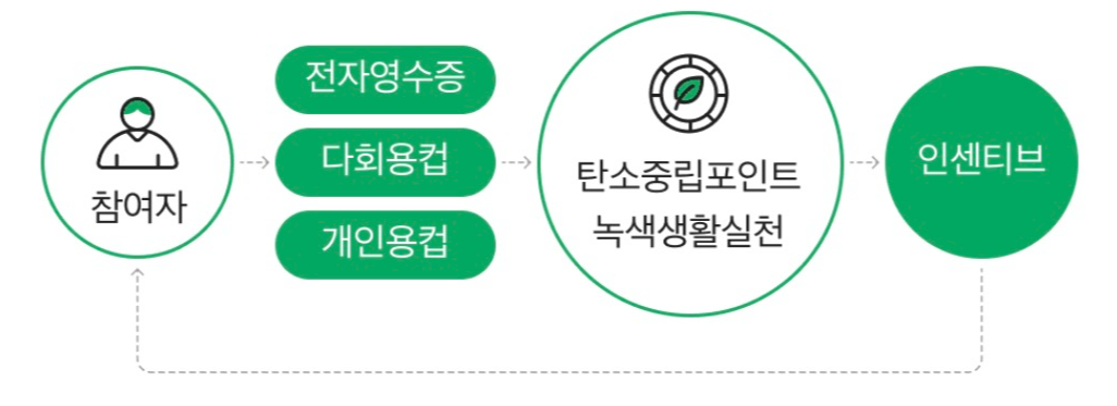 탄소중립포인트제는 탄소저감을 목적으로 친환경 활동을 참여하는 국민에게 이용실적에 따라 환경공단에서 인센티브를 지원하는 제도 입니다. 스타벅스에서 개인컵을 사용하는 경우 컵 당 300원, 리유저블 컵 반납시 컵당 300원, 전자영수증 발급시 건당 100원을 할인 받을 수 있습니다. 주문할 때 마다 개인컵+전자영수증 또는 리유저블컵+전자영수증을 동시에 하면 총 400원씩을 할인 받을 수 있으니 자주 가시는 분들에게는 쏠쏠한 할인이 될 것 같습니다.