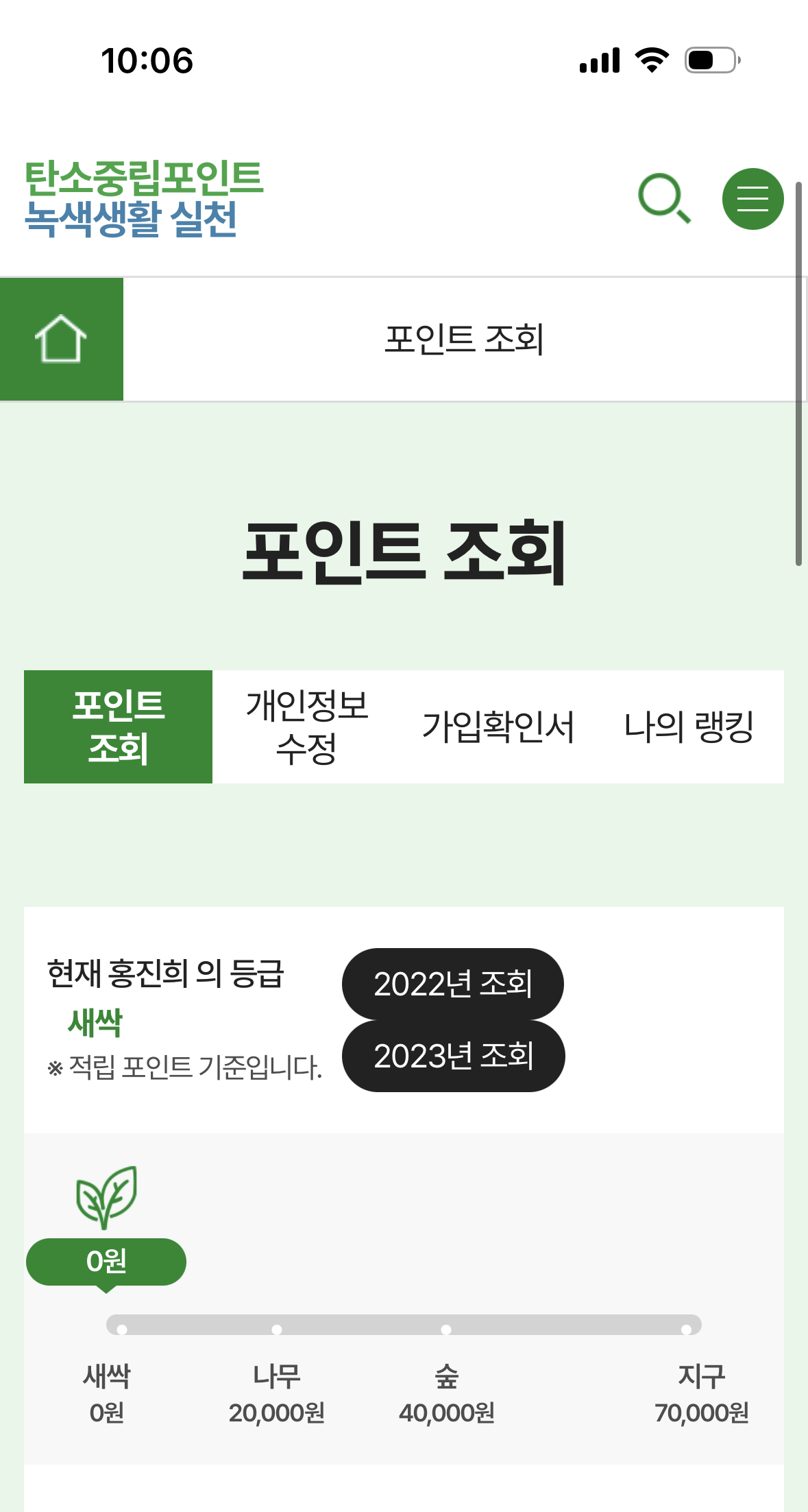 적립된 포인트는 탄소중립포인트 홈페이지(cpoint.or.kr) > 마이페이지에서 확인 가능합니다.