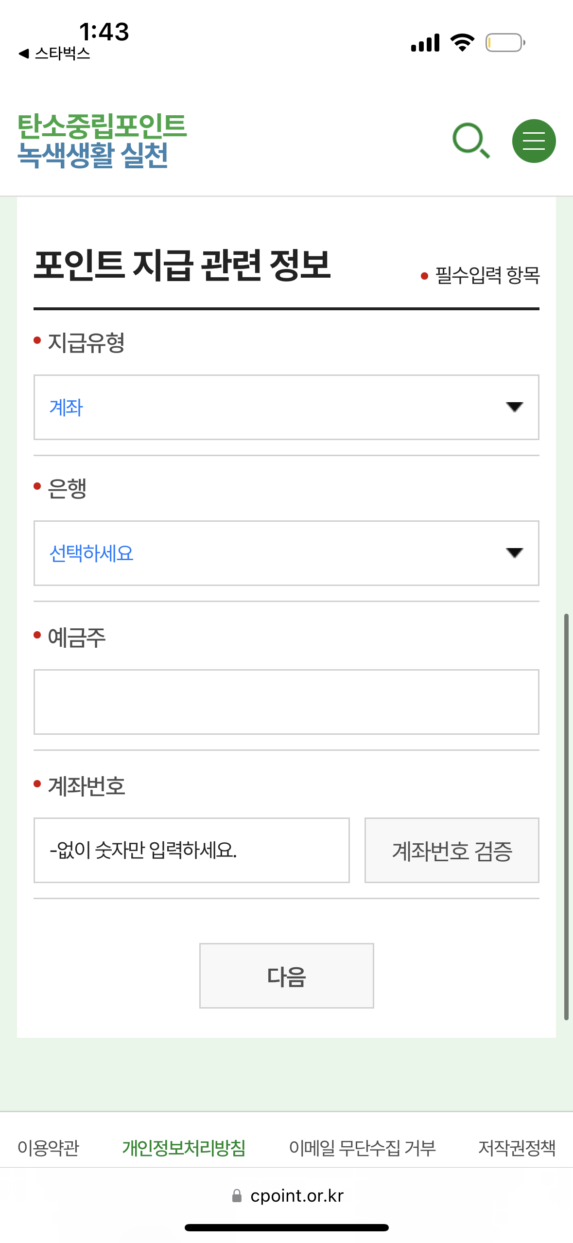 7. 마지막으로 포인트를 받을 계좌 정보를 입력하면 끝!