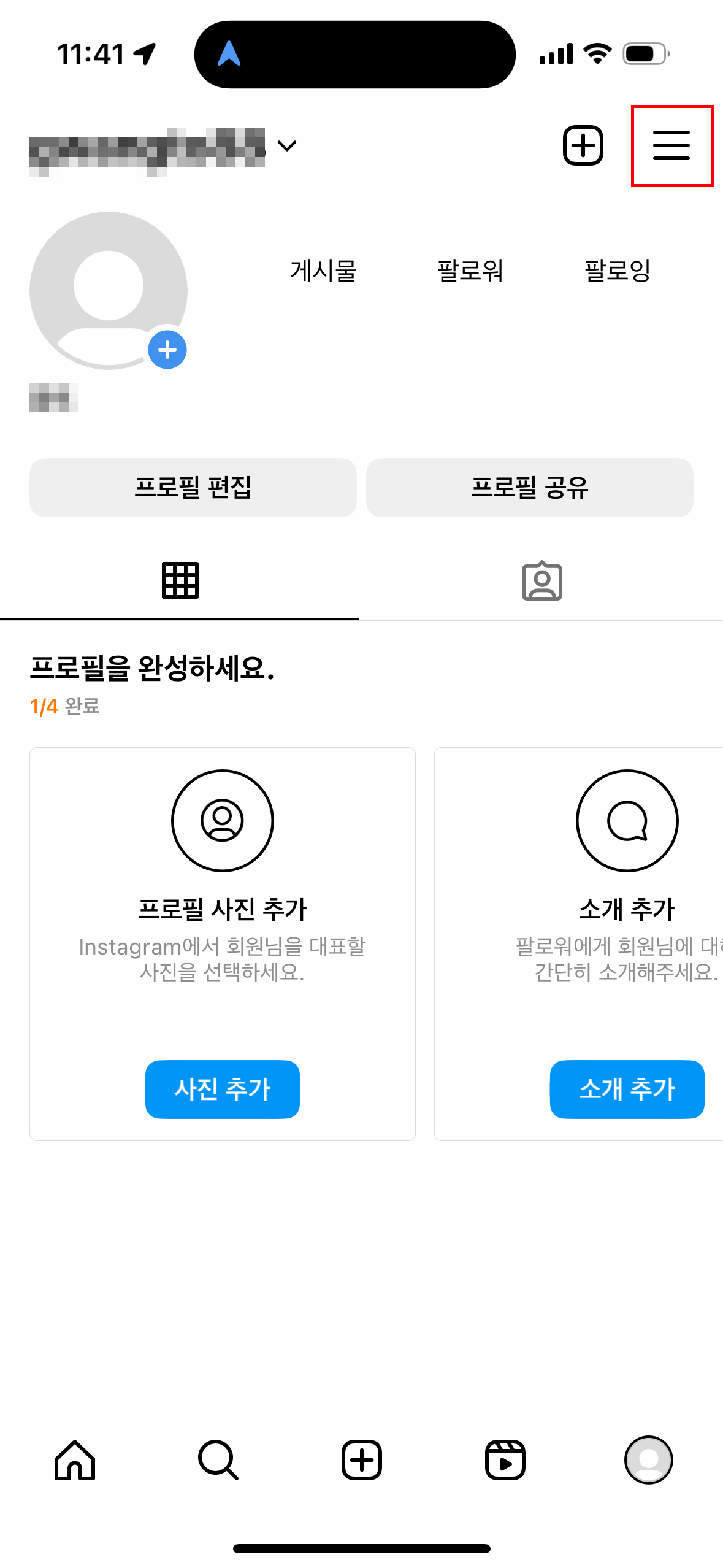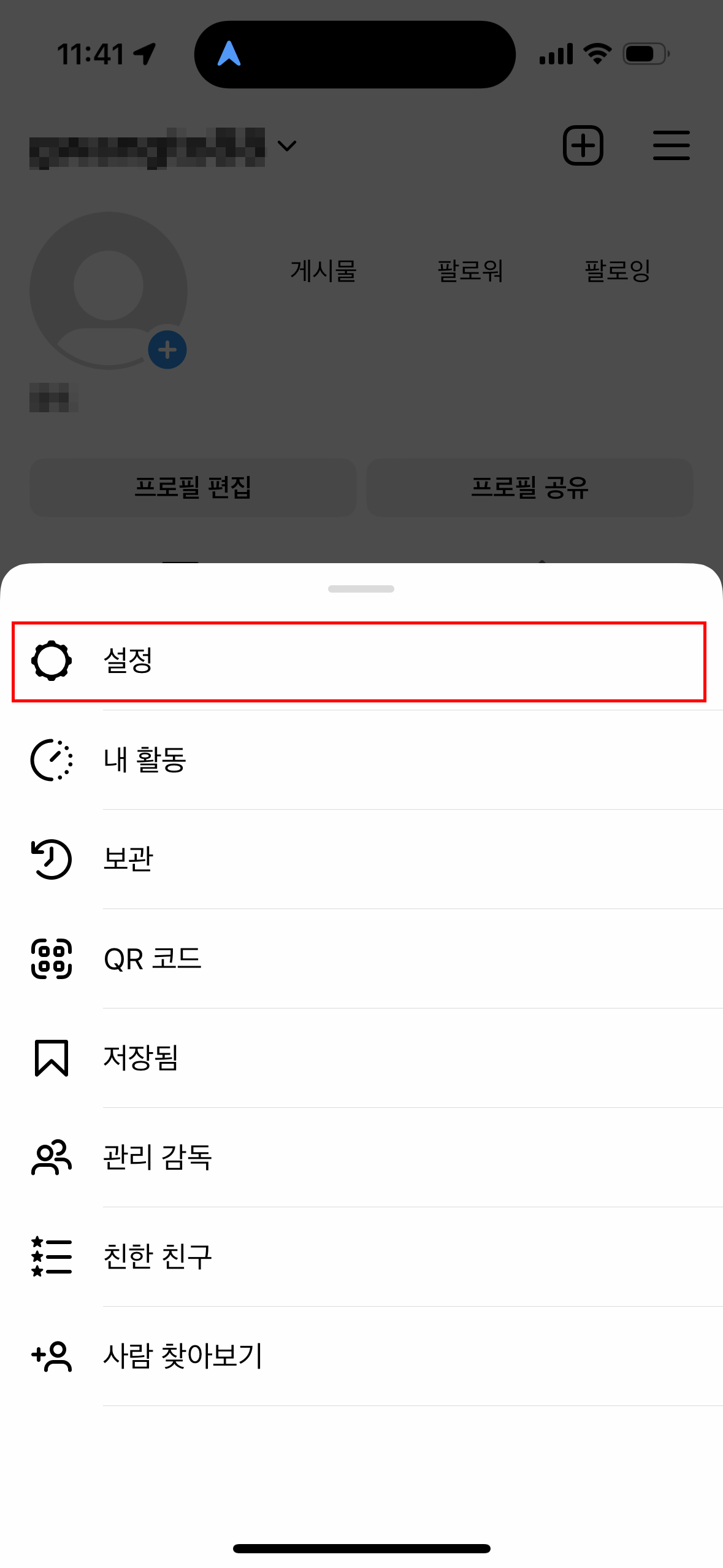 1. 내 인스타그램 계정 우측 상단의 햄버거 메뉴를 누릅니다. 메뉴 중에서 '설정'을 눌러주세요.