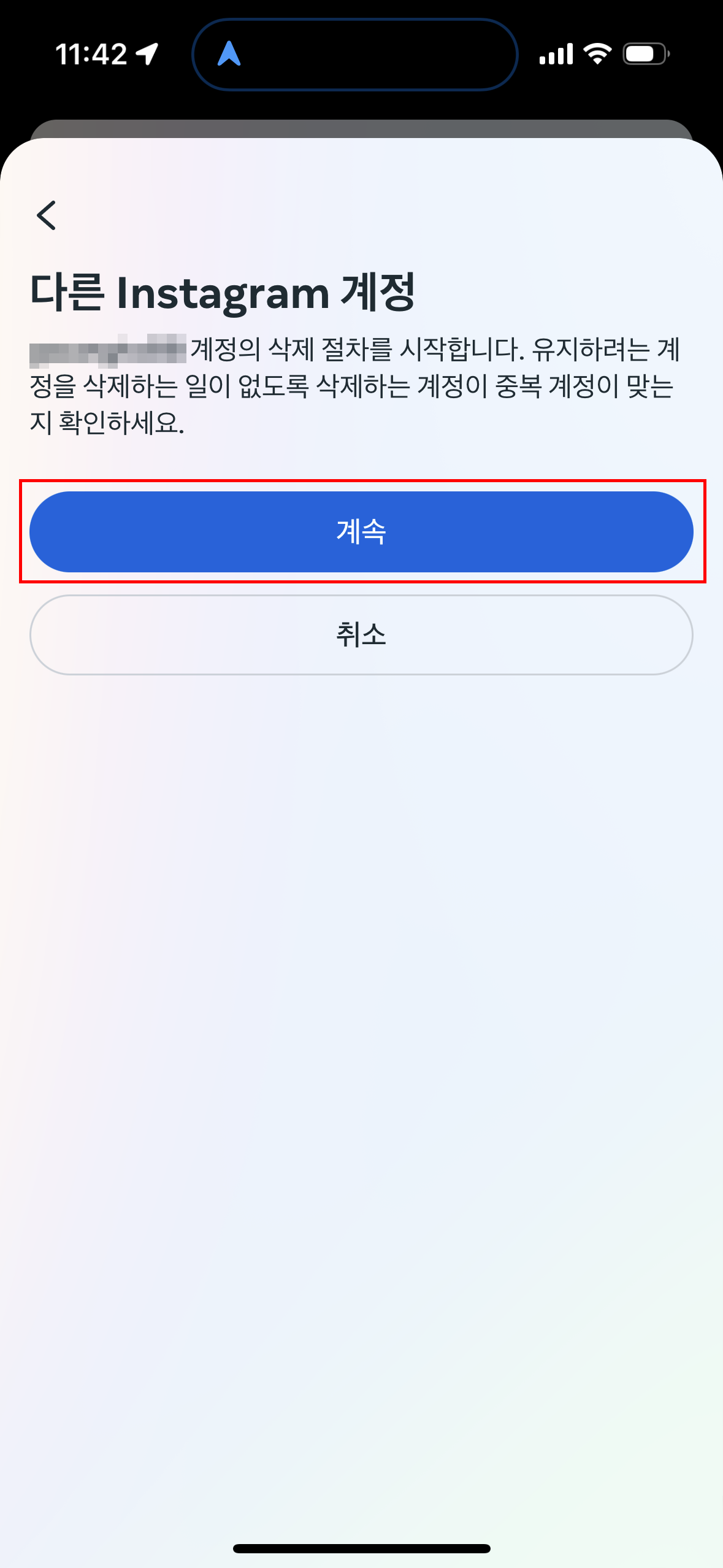 7. 계정 삭제 절차를 시작한다는 메세지가 뜹니다. '계속'을 누르고, 비밀번호를 한번 입력해주세요.