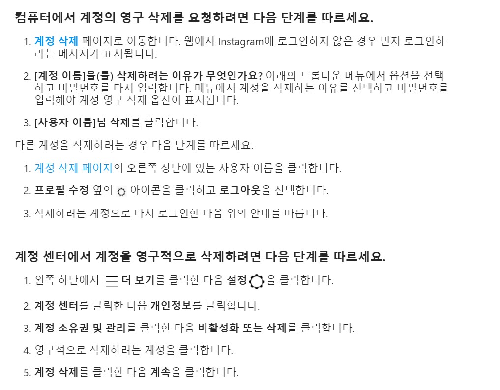 인스타그램  고객센터 내용을 기반으로 실제 계정 삭제 방법을 스크린샷으로 정리해두었습니다.