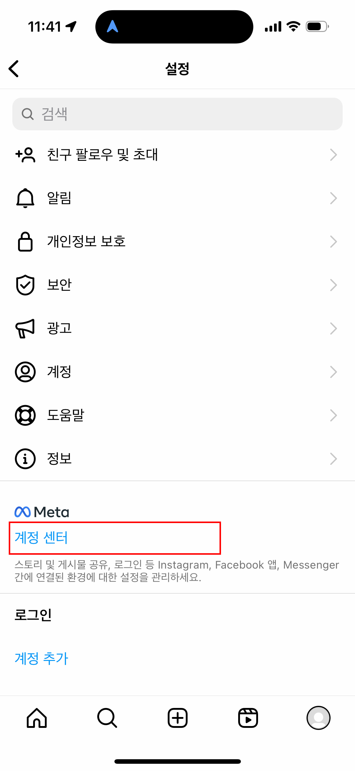2. 설정 메뉴중에 아래쪽 파란색 글씨 '계정센터' 를 누릅니다.