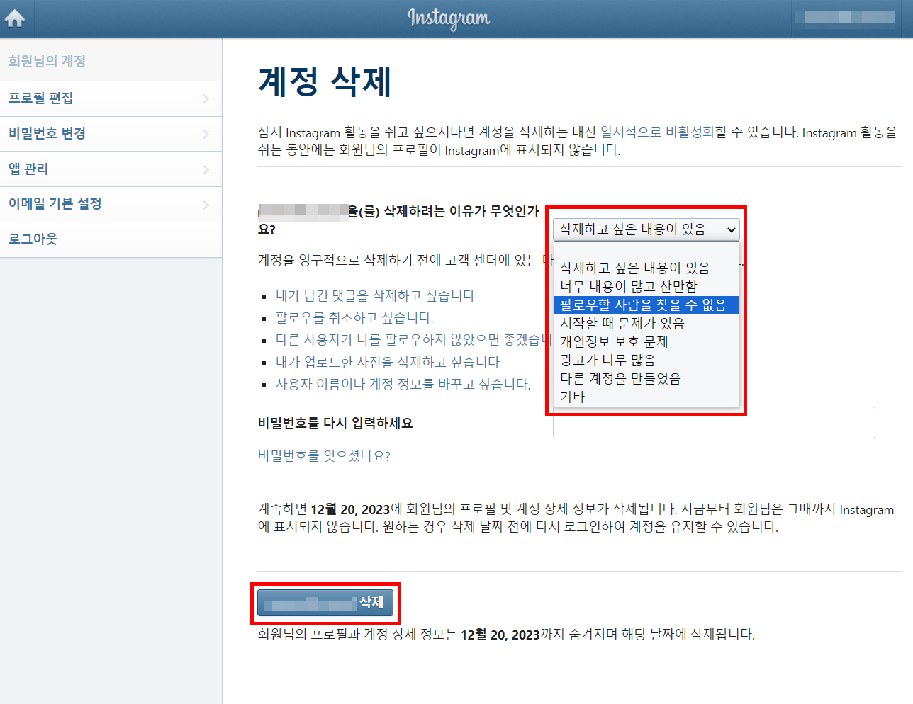 인스타그램 앱 탈퇴 계정 삭제 방법
