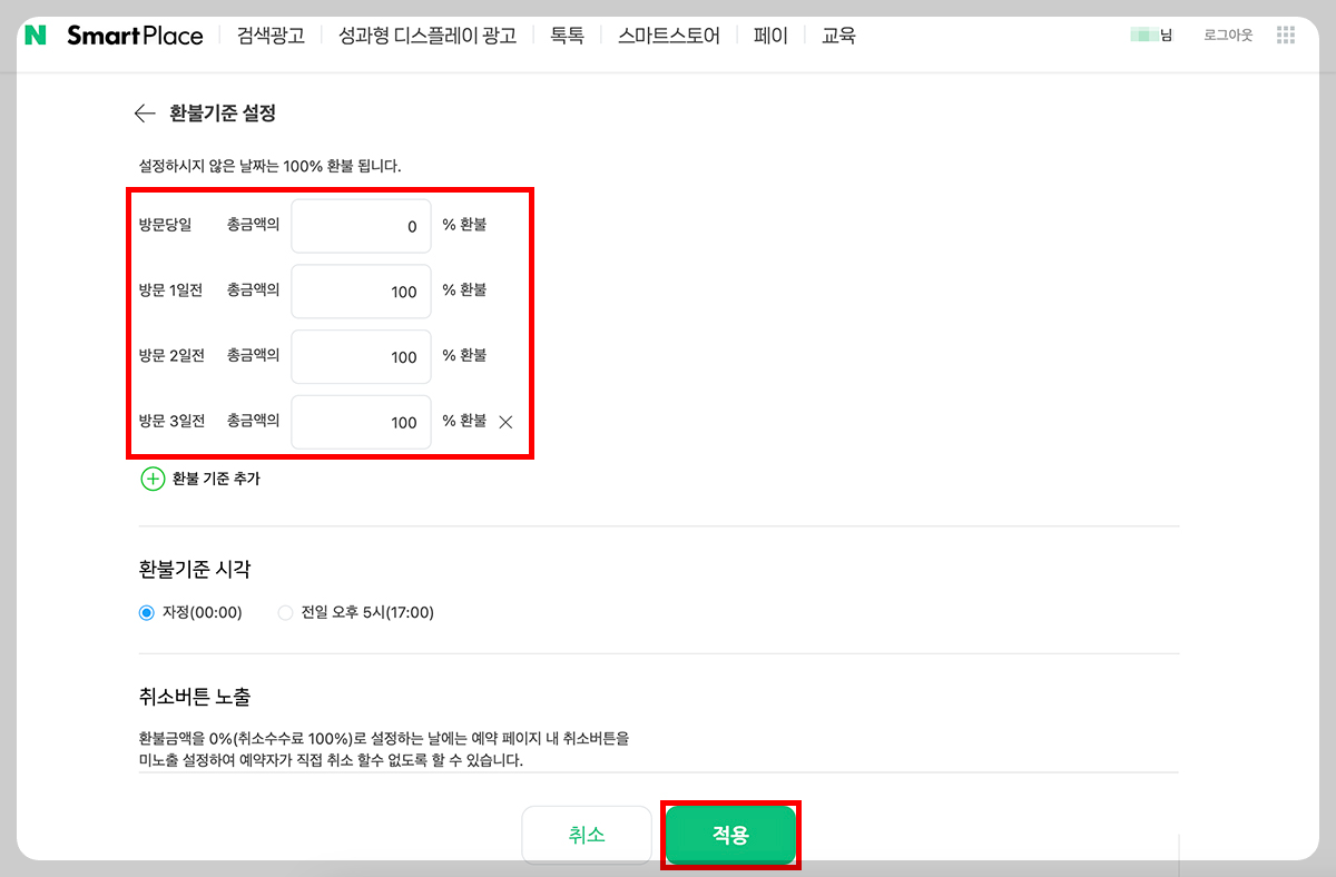 방문당일, 방문 1일전, 2일전 등 원하는 기준에 맞게 환불 기준 설정하시고 아래 '적용'버튼을 눌러주면 끝입니다.
