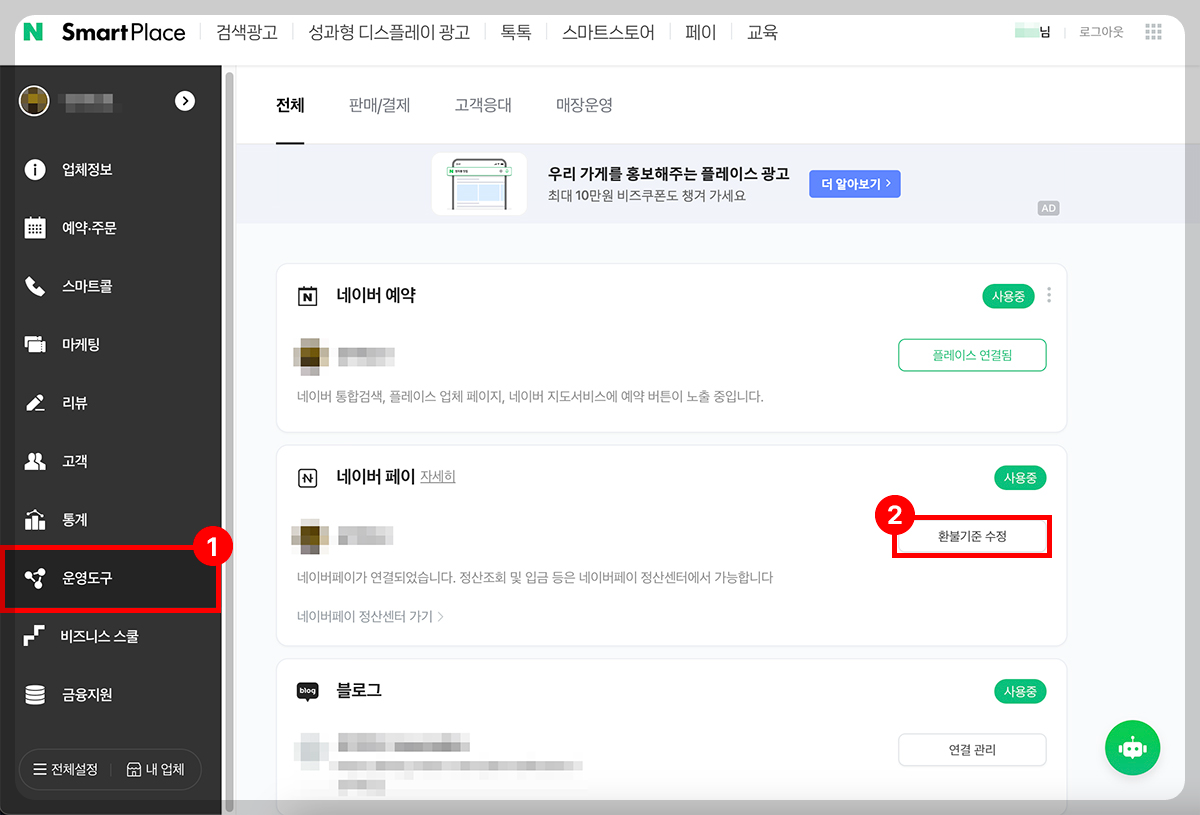 2. 왼쪽 메뉴에서 '운영도구'를 클릭한 뒤, 가운데 화면의 네이버페이에서 '환불기준 수정'을 눌러줍니다.