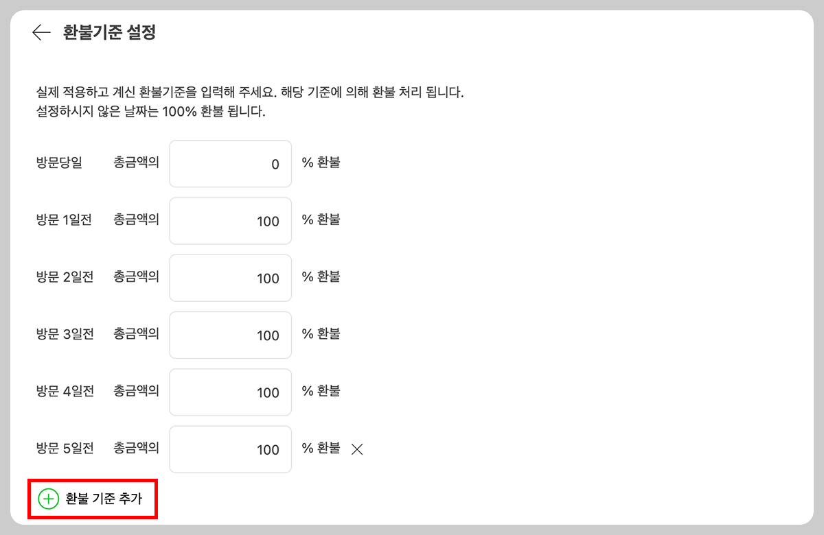 환불 기준 추가 버튼 누르면 방문 10일전까지 환불기준 설정 가능해요!