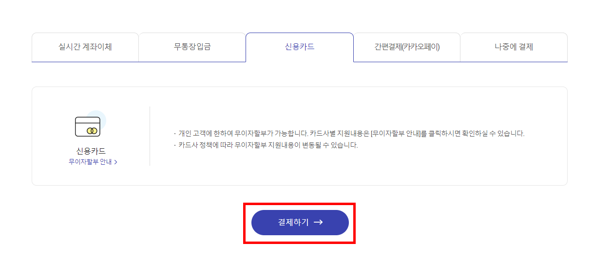 14) 마지막으로 보험료 결제를 하는데, 실시간계좌이체, 무통장입금, 신용카드, 간편결제 모두 가능합니다.
