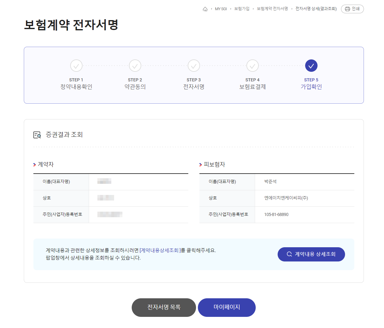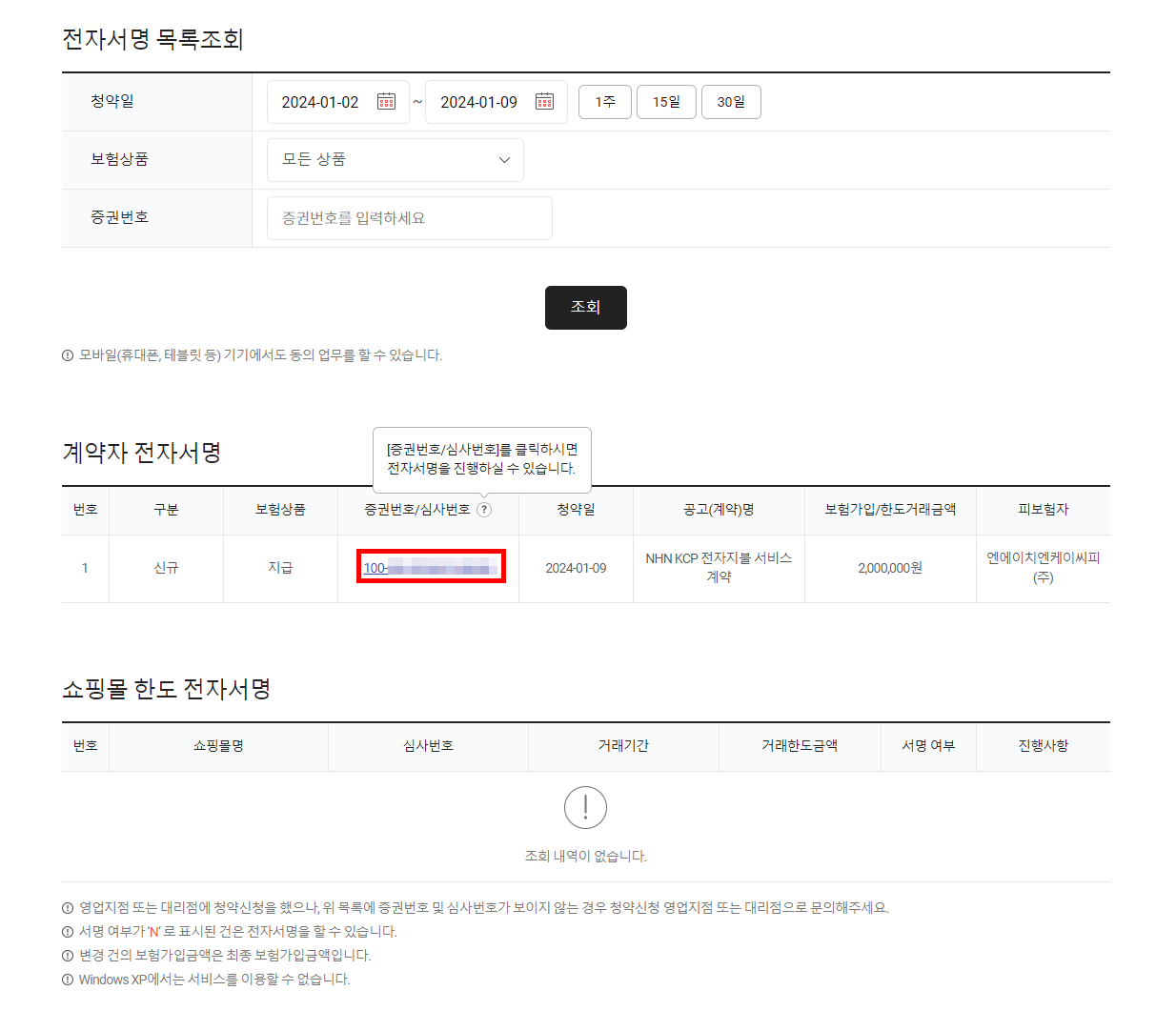 10) 중간에 계약자 전자서명란에서 증권번호를 클릭합니다.