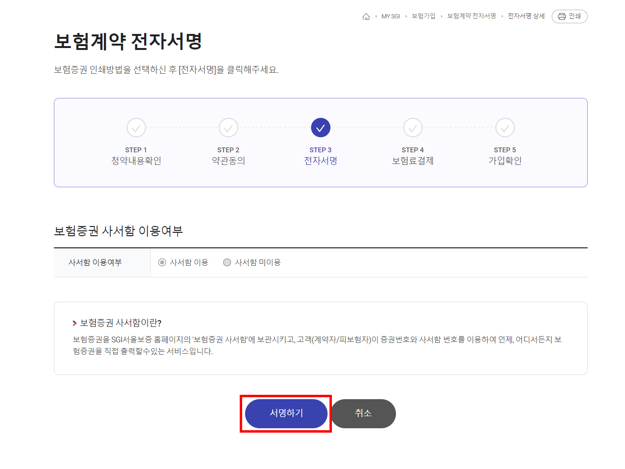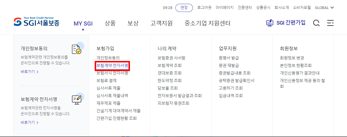 서울보증홈페이지에서 MY SGI > 보험가입 > 보험계약 전자서명을 클릭합니다.