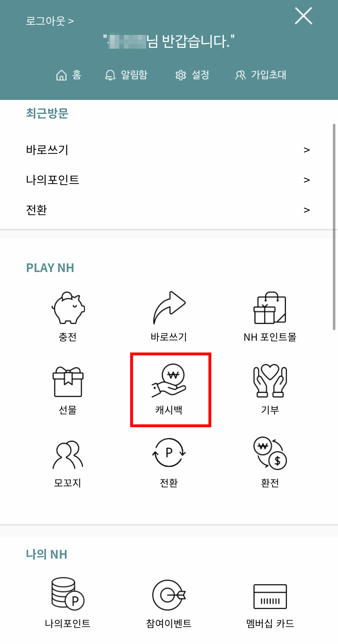 3) 메뉴에서 '캐시백'을 눌러주세요!