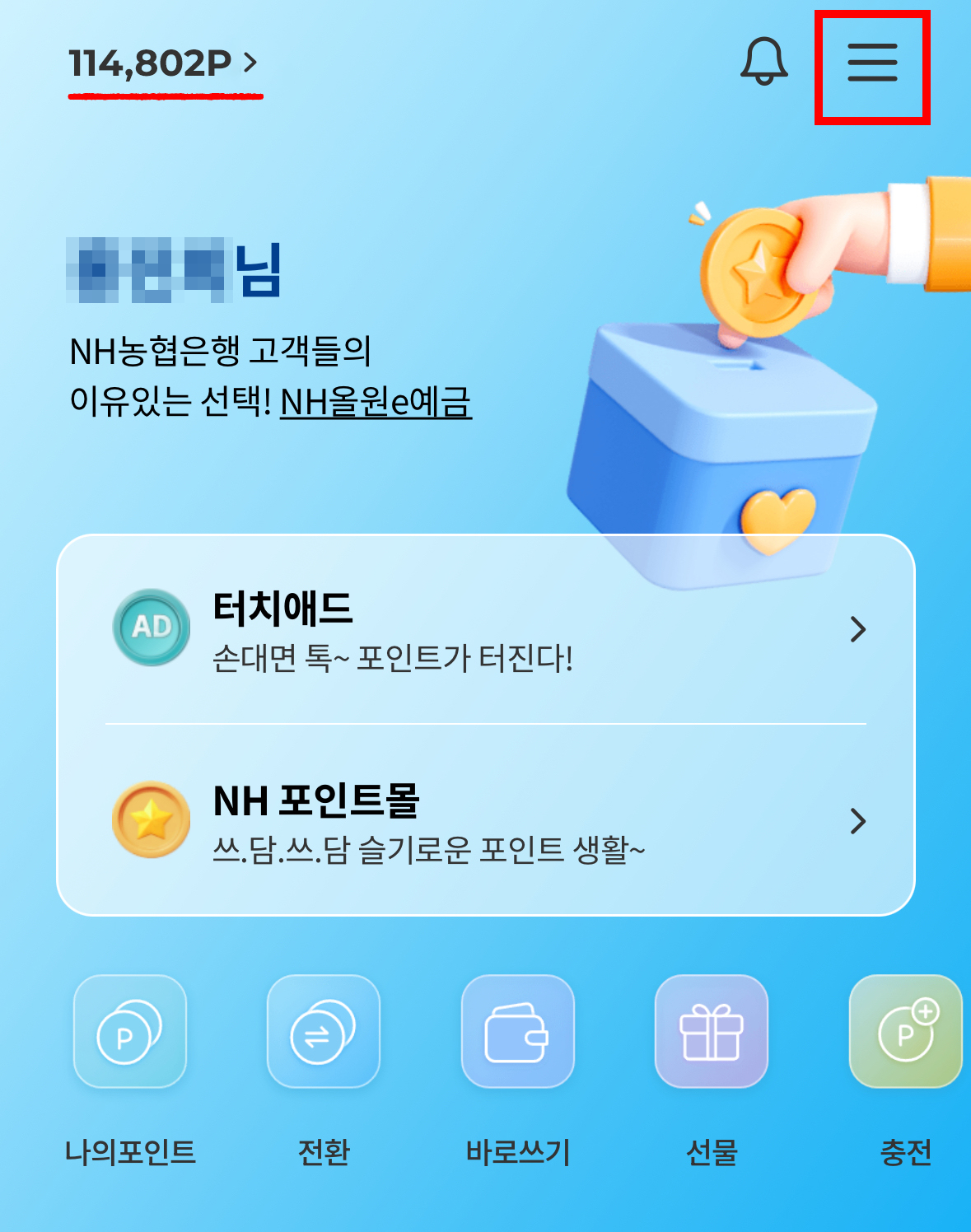 현금으로 전환하는 방법은 우측의 햄버거 메뉴를 터치합니다.