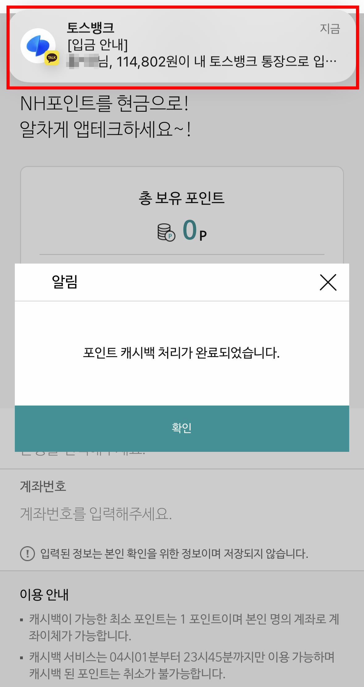 5) 입금하기 버튼 누르자마자 입금되었다는 알림을 받았습니다. 이리도 쉽고 빠르게 캐시백이 되네요!