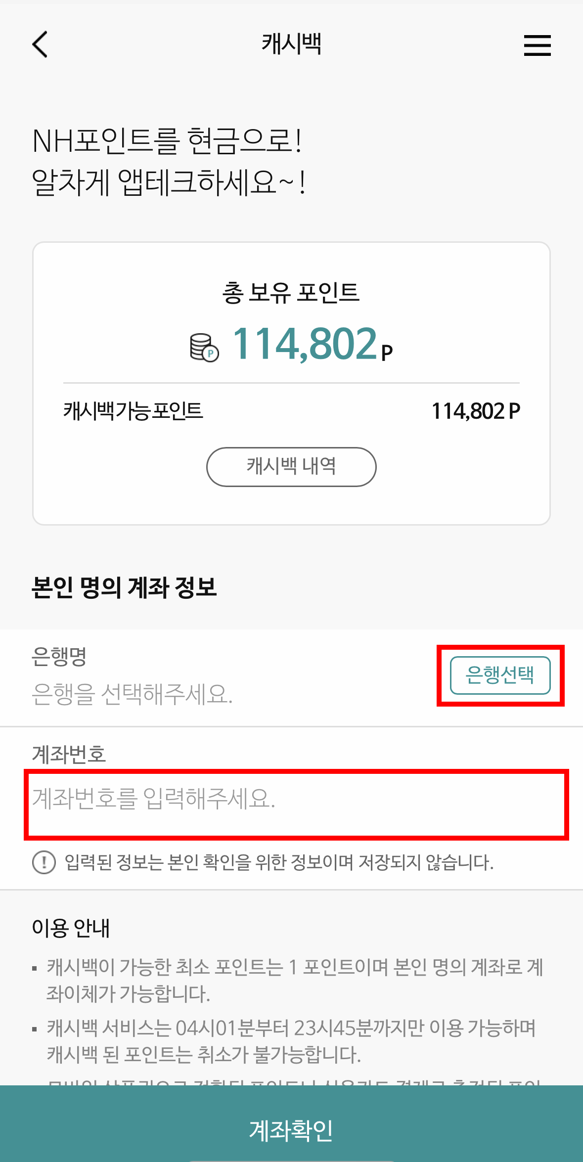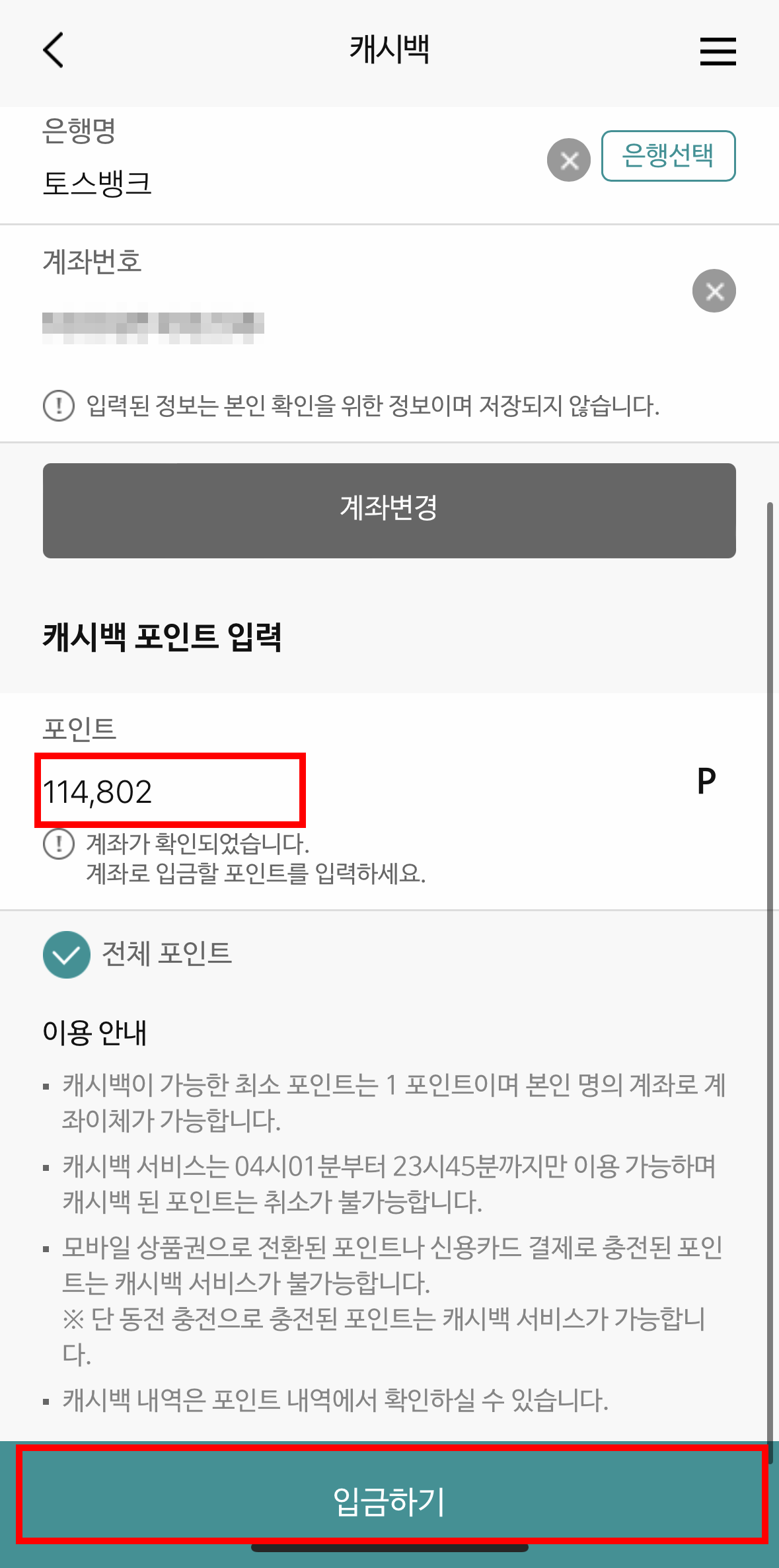 계좌 확인이 되면 캐시백 받을 포인트를 입력할 수 있는데요. 저는 전체 포인트를 입력했습니다.