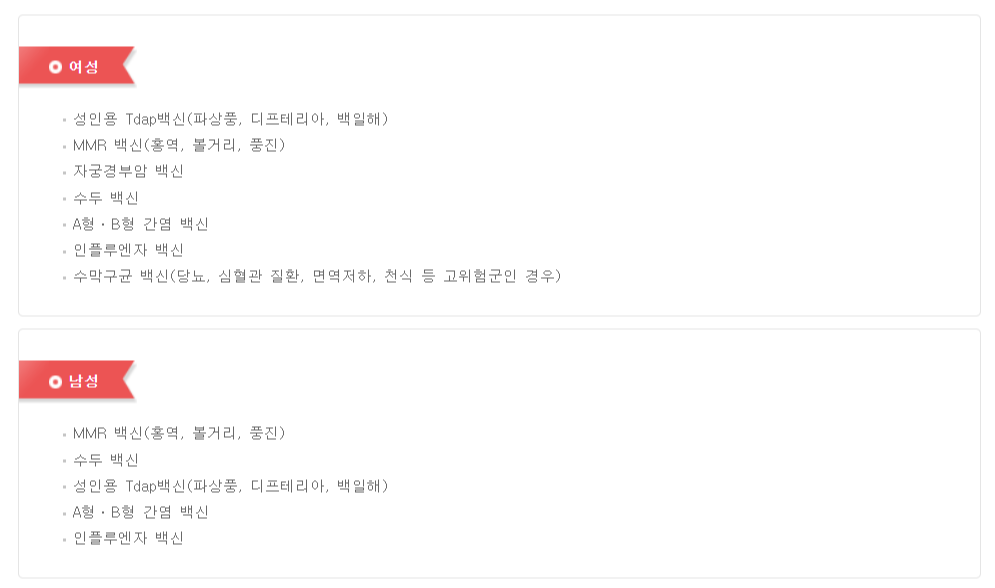 여성/남성 공통으로 필요한 예방 접종은 MMR 백신 (홍역, 볼거리, 풍진), Tdap백신 (파상풍, 디프테리아, 백일해),  A형·B형 간염 백신, 수두 백신, 인플루엔자 백신이며, 여성은 추가로 자궁경부암 백신, 수막구균 백신(당뇨, 심혈관 질환, 면역저하, 천식 등 고위험군인 경우)을 맞아야 합니다.