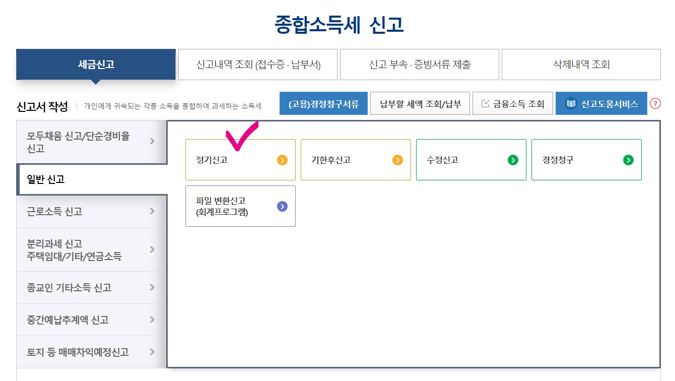 1) 신고도움 창을 끄고 종합소득세 신고 페이지에서 일반신고 > 정기 신고를 클릭합니다.