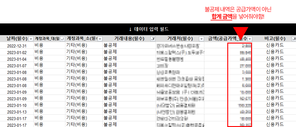 - 불공제건은 금액에 공급가액이 아닌 합계 금액 입력!