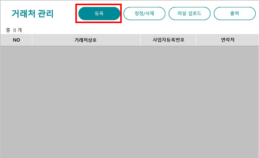 3) 거래처 관리 - 상단의 [등록] 버튼을 눌러 등록합니다. 한 개 이상의 거래처가 등록되어야 프로그램이 돌아가니 꼭 한개이상 등록해주세요.
