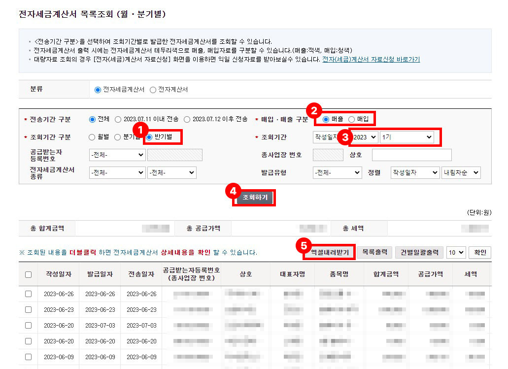 2) 조회기간 구분을 '반기별' / 매입 매출 구분을 선택하고, 조회기간을 소득세 신고년도 1기 또는 2기를 선택 후, [조회하기]를 클릭합니다. 그러면 목록이 뜨는데, 위쪽의 [엑셀내려받기]를 클릭하여 목록을 엑셀로 다운 받습니다.