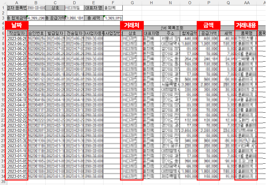 3) 그러면 이런식으로 엑셀 목록이 나오는데, 내역을 복사하여 아까 생성된 장부 대량등록 파일에 넣어주면 됩니다.