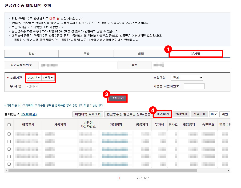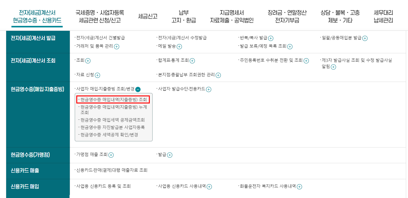 1) 현금영수증도 비슷한 방식으로 현금영수증 매입내역(지줄증빙)조회를 눌러 내역을 조회합니다.