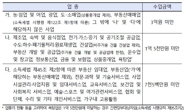 해당연도에 신규로 개업하였거나, 직전연도 수입이 아래와 같은 경우 간편 장부 대상자 입니다.