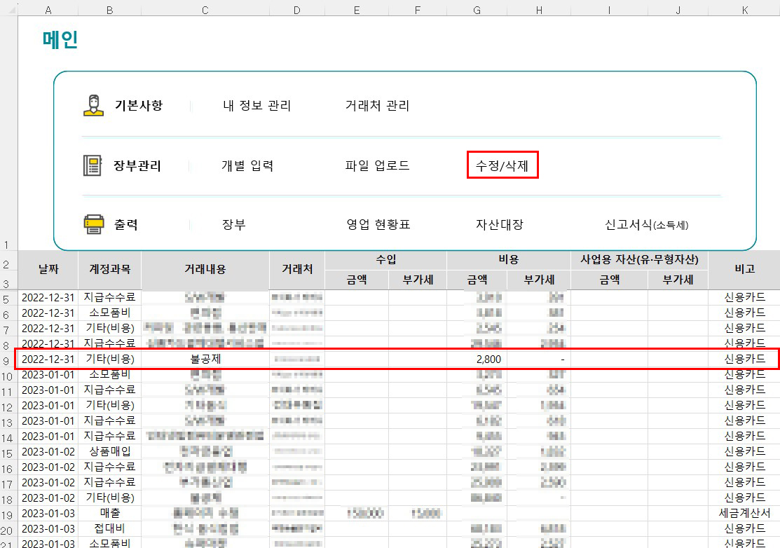 이때 현금영수증이나 신용카드 매입 내역 중 불공제 항목의 경우 수정/삭제를 눌러 부가세를 0으로 만들어주어야합니다.