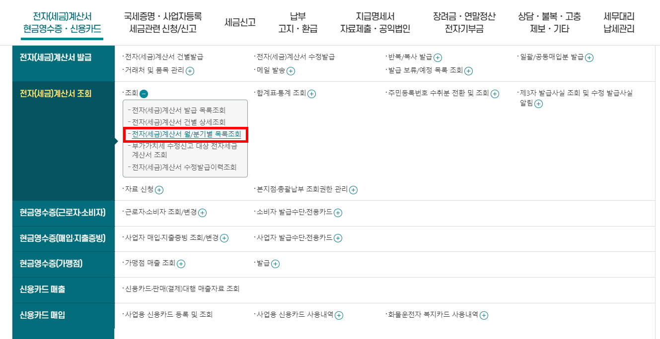 1) 홈택스에서 전자(세금)계산서/현금영수증/신용카드 > 전자(세금)계산서조회 > 조회 > 전자(세금)계산서 월/분기별 목록 조회를 클릭합니다.