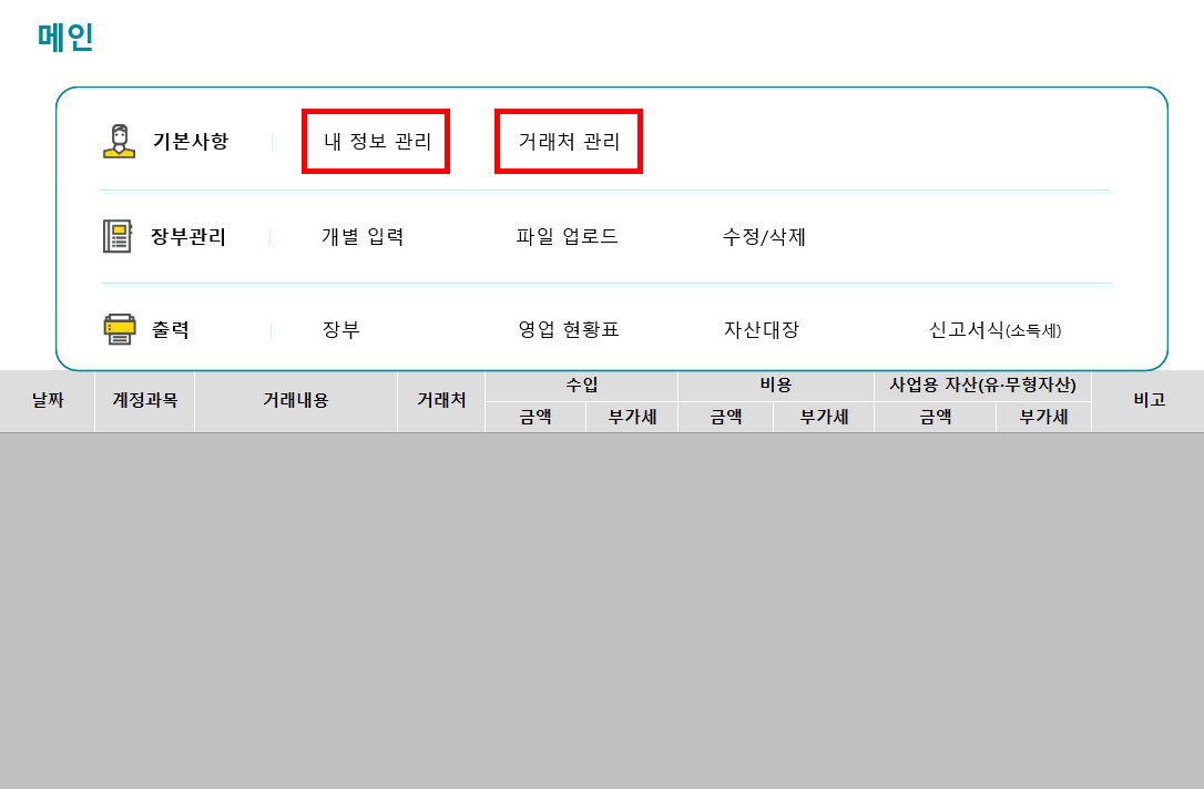 1) 엑셀 프로그램을 열고 가장 먼저 해야할 일은 [내 정보관리]와 [거래처 관리]를 눌러 기본 정보를 등록해주어야 프로그램이 돌아갑니다.