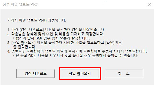 1) 장부를 모두 복사붙여넣기 하여 완성했다면, 다시 간편장부프로그램으로 돌아와 업로드해줍니다. [파일업로드] 클릭 후, [파일불러오기]를 클릭하여, 방금 작성한 장부를 불러옵니다.