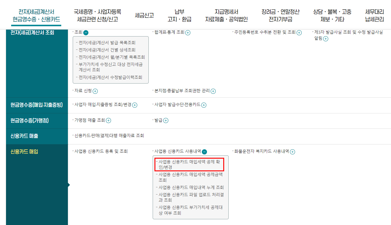 매입의 경우 매입 항목에서 사업용 신용카드 사용내역 > 사업용 신용카드 매입세액 공제 확인/변경 페이지에서 확인 가능합니다.