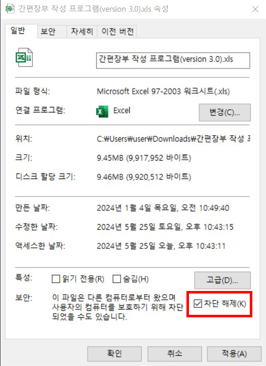 차단해제에 체크한 뒤, 확인을 누르시고 다시 엑셀 파일을 여시면 프로그램을 정상적으로 사용하실 수 있습니다.