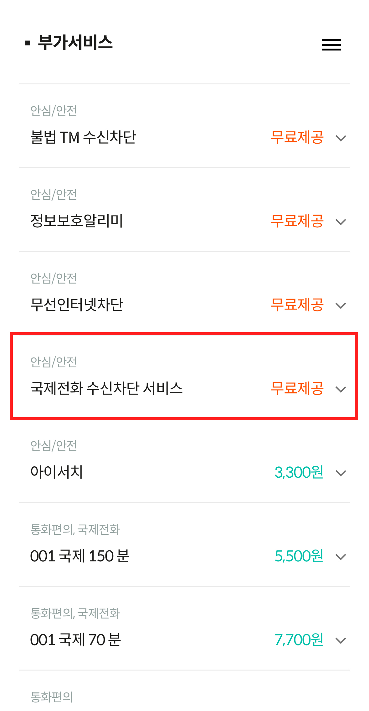 오른쪽 상단 햄버거 메뉴를 눌러 상품소개 > 부가서비스 > 전체 부가서비스를 누릅니다.