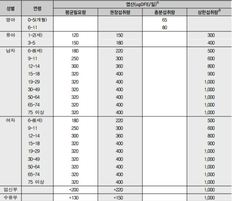 보통의 상황에서는 성인의 엽산 권장섭취량은 400㎍입니다.