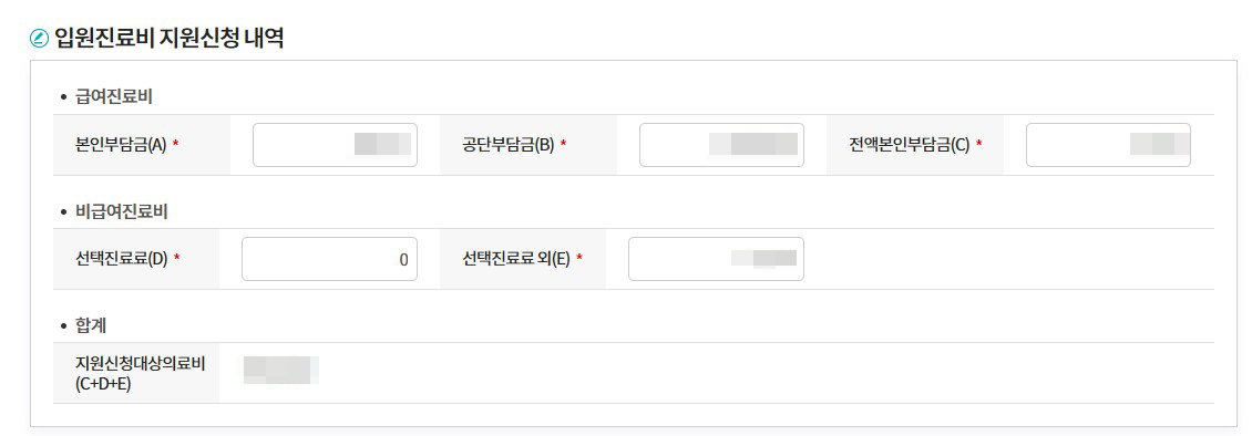 급여 진료비, 비급여 진료비 등 입력하는 칸이 있는데, 입원치료비를 각 항목에 맞게 계산해서 입력하면 됩니다.