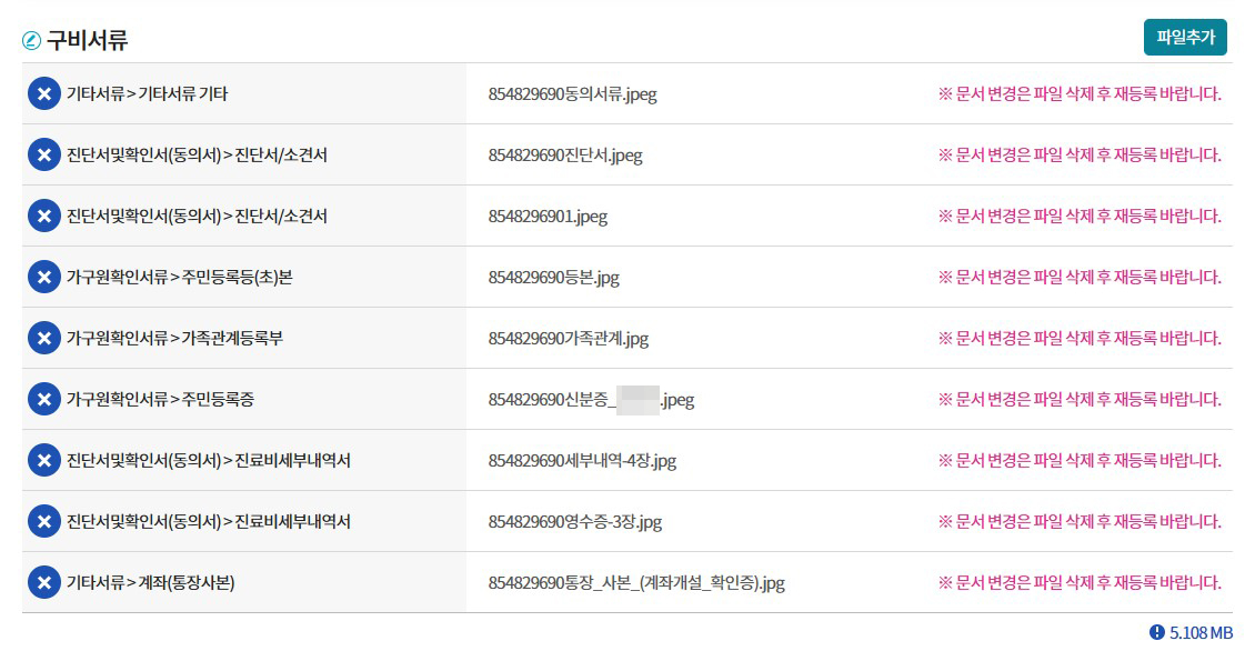 - 입퇴원확인서, 진료비 영수증, 진료비 세부내역서 각 1부