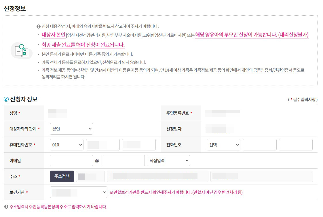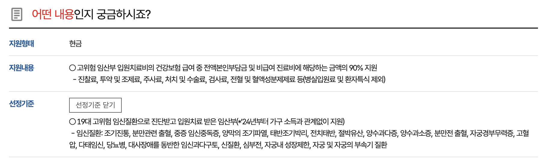 * 소득조건 : 24년도부터는 가구 소득과 관계없이 고위험 산모라면 모두 지원