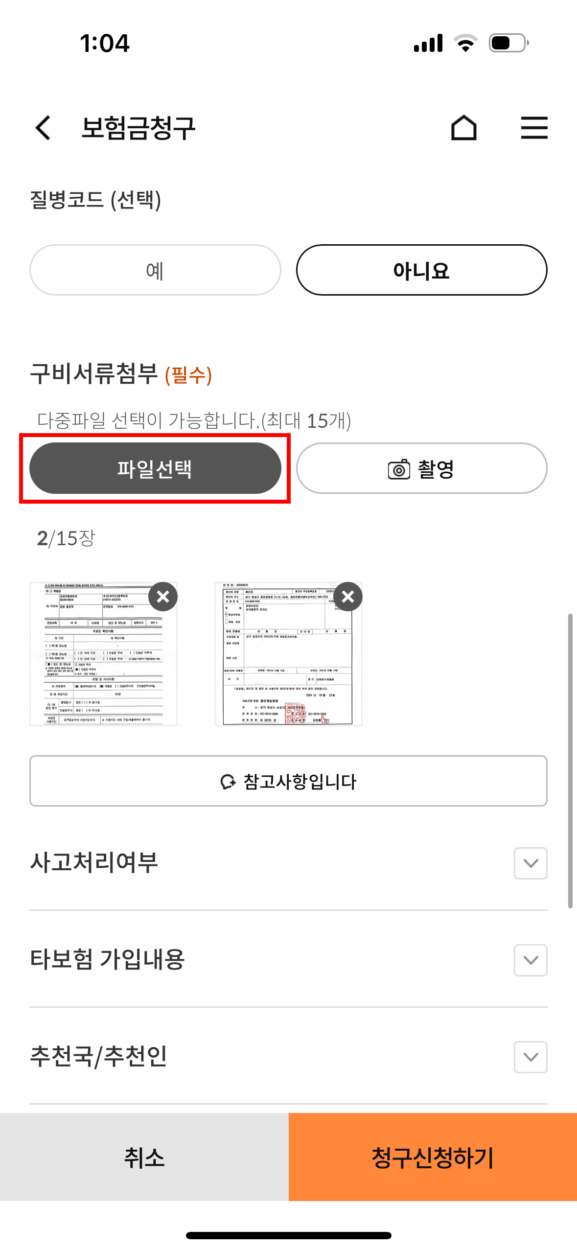 우체국에 방문하여 서류를 제출해도되고, 간편하게 우체국보험 앱으로 청구가 가능합니다. 저는 집에서 간편하게 앱으로 접수했어요. 서류만 준비되어있다면 1분도 걸리지 않으니 앱으로 하시는걸 추천합니다.